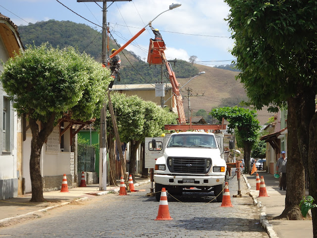 As antigas lâmpadas de vapor de mercúrio (luz branca) estão sendo trocadas por lâmpadas de vapor de sódio (luz amarela), melhorando a iluminação e economizando a energia da cidade.